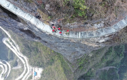 4月8日,施工人员在更换玻璃栈道的玻璃。当天,张家界天门山景区对盘龙崖玻璃栈道的27块玻璃进行更换,为游客提供更加安全、舒适的旅游体验。
