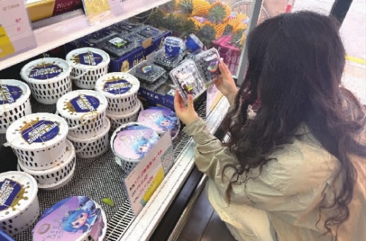 “脆甜可口的15毫米果型的花香蓝莓团购优惠价36.78元一桶,足足有500克,今天进货不多,库存告急。”绿叶水果兴汉门店店主向每名进店的顾客热情地介绍着,一眨眼的功夫便售出2份。记者观察到,彼时不到中午13时,摆放桶装蓝莓的区域便只剩下最后6份。