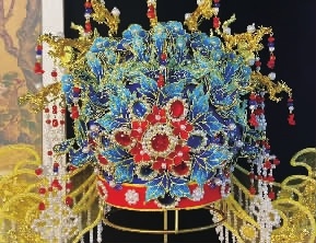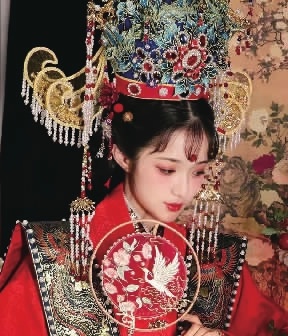 “我一直非常喜欢中华传统文化,特别想为自己的中式婚礼制作一款凤冠。就用铜骨架、绣片工艺、花式镶嵌,搭配仿真蓝宝石、红宝石和天然珍珠,制作了这顶九龙九凤冠。”侯贞雪介绍,她制作的这顶“九龙九凤冠”设计灵感来源于明代皇后册封、朝会、揭庙等场合所佩戴的礼冠。