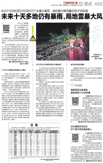 4月21日,强降雨在长江沿线强势登场,局地强度4月少见。在21日夜间,强降雨区域南压,湖南多地暴雨、大暴雨继续在线,局地还有10级以上雷暴大风。这轮降雨过程之后,24日至25日、26日至28日还有两轮降雨轮番袭湘。