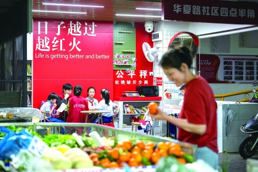 4月23日,志愿者与学生在长沙华夏农贸市场“四点半角”读书、学习。去年10月,长沙市开福区新河街道华夏路社区联合华夏农贸市场实施改造,为商户子女在市场入口处的黄金位置打造阅读空间——“四点半角”,解决商户子女只能伏在摊位写作业、存在课后管理盲区等难题。近日,重新升级打造的“四点半角”正式亮相,灯光更加明亮,书籍种类更加丰富。新华社 图