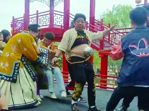 “一二三,拉!”4月21日,位于山西省晋城市的司徒小镇内,一场1V9的“拔河比赛”正在进行。来自湖南常德的周鹏程身着轻便的练功服,将一只普通的不锈钢碗扣在自己的腹部,用肚皮吸附着碗口,任凭前后9人全力拉扯。9人使出浑身解数仍无法将碗拉开,现场观众直呼神奇。■文/视频 三湘都市报全媒体记者 高煜棋 通讯员 冯瑶瑶 刘艺博