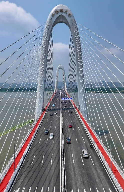 4月28日,车辆行驶在长沙兴联路大桥。当日,兴联路大桥正式通车试运行,长沙过江通道总数增至15条。大桥以148米高的主塔与江心月亮岛遥相呼应,在粼粼波光中勾勒出“双月印江”的壮美画卷,通车后将有效缓解北二环交通压力,为长沙“一江两岸”协同发展按下“加速键”。