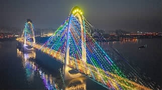 大桥的细节设计同样匠心独运:双向八车道的机动车道与独立过江慢行系统完全隔离,市民在桥上可欣赏月亮岛的美景,凭栏静赏“落霞与孤鹜齐飞,秋水共长天一色”的江景。夜间,桥体灯光以暖黄色为主色调,与月亮岛的景观照明形成“星河落九天”的视觉盛宴。