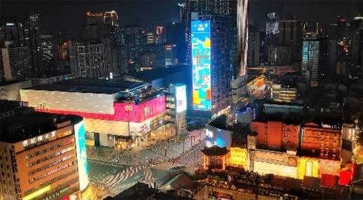 4月28日,长沙五一商圈司门口“城市生活家”外立面的巨型LED屏幕完成最终调试,这座高86.4米、覆盖1600的“垂直巨幕”正式进入试运行倒计时,4月29日至30日将拆除高空吊篮及防护棚,5月1日开启试运行。图为长沙五一商圈86米超级大屏完成调试。