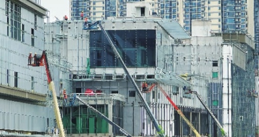 长沙市妇幼保健院(河西新院)项目现场,近500名建设者攻坚医疗专项工程。门诊楼外,工人们借助曲臂车安装曲面铝板;产房区里,技术团队调试智能物流传输系统。这座按三甲标准建设的医院预计下半年开院,将提供从孕前到老年妇女的全生命周期健康服务。