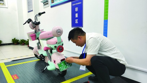5月8日10时许,在长沙市爱玛电动自行车店,黄女士花两千多元购买了一台马卡龙配色的电动自行车,她推车来到几十米外的车站南路电动自行车登记服务点,工作人员对车辆情况进行核实,查看相关资料、测量车辆相关数据后,给黄女士发放了电动自行车牌照,并帮忙安装。
