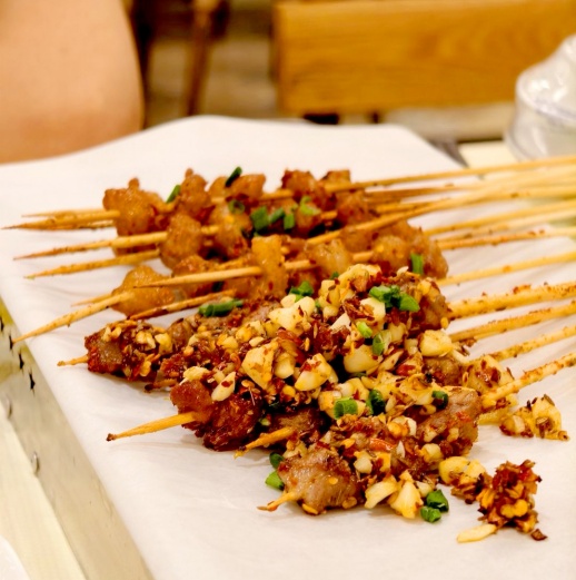 牛油是岳阳烧烤的灵魂。取自黄牛胸口的脂肪粒,状如白玉,粒粒饱满。上炉后猛火急攻,牛油表面迅速结出金黄脆壳,内里却化作一汪滚烫的脂香。入口瞬间,脆壳“咔嚓”碎裂,油脂混着调料的香气在舌尖炸开,配上一口冰镇啤酒,冷热交织,快意顿生。