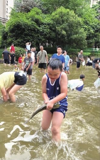 图①:6月1日,长沙观沙岭阳光丽城小区,小区物业提前在池塘投放了300尾鱼,孩子们上演了一场别开生的抓鱼活动。通讯员 供图
