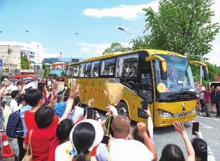 随着红旗在空中飘荡,战鼓声声回响。下午时分,高考学子们在全校师生及家长的欢送下登上26辆大巴,在欢呼与祝福声中缓缓驶出校园,奔赴各自的考点。