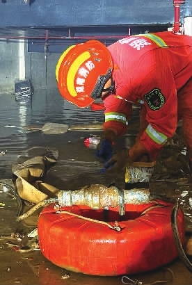图②:6月22日,消防员在桑植县新澧源大市场地下车库排涝清淤。 三湘都市报全媒体记者 项炜 顾荣 何佳洁