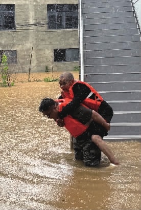图③:6月22日,通道侗族自治县牙屯堡镇老寨村,救援人员在转移被困老人。杨梦纯 李舒丹 摄