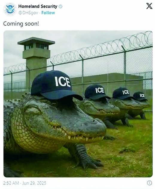 对美国官员来说,“鳄鱼”似乎成为这座监狱的“卖点”。一些美国官员在社交媒体上贴出头顶美国移民与海关执法局制服帽的鳄鱼画像,佛州共和党则售卖鳄鱼主题的衣物和啤酒瓶套。