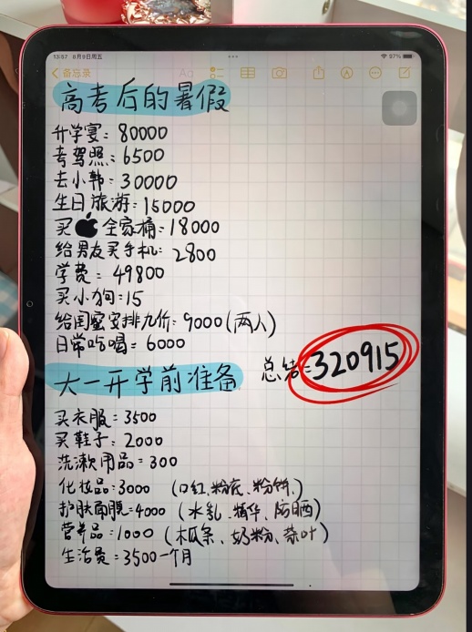 在社交媒体平台,也有不少考生列举了自己高考后的开支,或是总结了自己的考后“必买清单”。“刚结束考试逛街爸妈给买了大概2000元的衣服鞋子,报名考驾照花费约4000元。成绩出来后手机和笔记本电脑共支出12000元,后续还打算做近视眼飞秒手术要准备2万元。”一位自称普通家庭的考生小娟(化名)列出了自己的考后消费清单一览表,“每一项都挺必须,没有特别超纲的,就是集中在一个节点上,加起来就多了”。