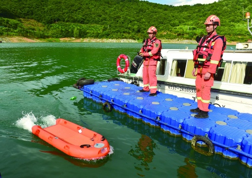 7月23日,资兴市东江湖长盈头码头,救援人员进行无人航行水面移动救生担架操控训练。日前,该市成立东江湖区域联合执法及救援大队,配备了多类型救援装备,开展多场景水上应急演练,提升应对洪涝、台风灾害及突发水上事件的应急救援能力。贺茂峰 摄