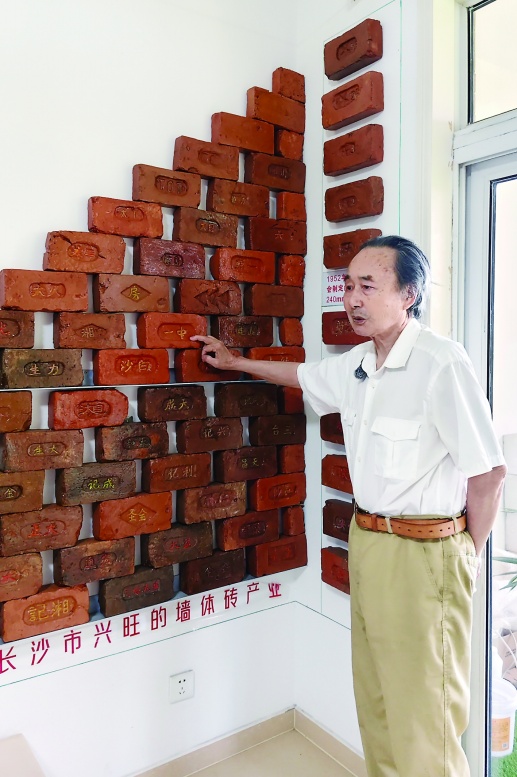 长沙76岁的潘正平老人家里,有一面特殊的“墙”,是由一百多块刻着不同文字、产生于不同年代的长沙老建筑红砖砌成的“历史墙”。