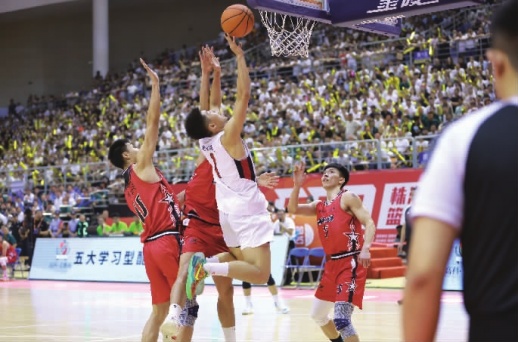 冠军之争,也是工业之魂的碰撞。7月27日晚,株洲市体育中心,经过激烈比拼,醴陵华鑫以78: 57战胜中车时代新材,为2025株洲“厂BA”画下圆满的句号。据组委会提供的数据显示,今年株洲“厂BA”开赛以来,已有540万人次现场观赛打卡,赛场外夜市交易总额超1800万元,拉动消费超1.6亿元。图为决赛现场。