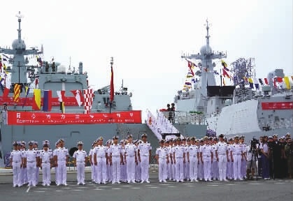 中俄“海上联合-2025”联合演习8月1日在俄罗斯符拉迪沃斯托克某军港开幕。演习在俄罗斯符拉迪沃斯托克附近海空域展开,将持续至8月5日。转入海上联合演习实施阶段后,双方将开展援潜救生、联合反潜、防空反导、对海作战等课目演练。图为参加联合演习的中俄双方官兵整齐列队。新华社 图