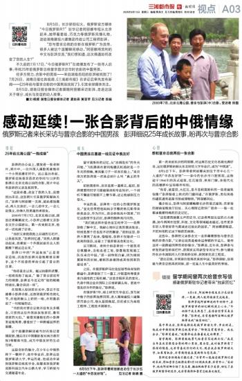 经多方努力,合影中的男孩——来自湖南岳阳的彭湃被找到了!7月26日,湖南日报社犇视频、《三湘都市报》在求证后率先发布新闻——《25年前与普京合影的中国男孩找到了》,引发全球媒体关注。