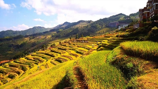 同一时间的怀化溆浦山背花瑶梯田,也以其雄壮阔气著称。“每年大概到9月中旬,梯田就会染上金色,最晚会持续到10月底。”山背花瑶梯田景区负责人舒建东介绍,“我们最佳的观景点位就在星空民宿和酒店的位置。在房间里就能一览梯田景色。”这里不仅展现庄稼的富足,更融入瑶族文化:花瑶同胞身着盛装,唱着高山号子,在田野间舞出秋日的节奏。