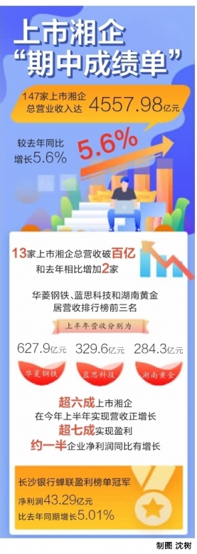 在盈利方面,上半年湖南上市公司总归母净利润为304亿元,较去年同比增长13.4%。超六成上市湘企在今年上半年实现营收正增长,超七成实现盈利,约一半企业净利润同比有增长。