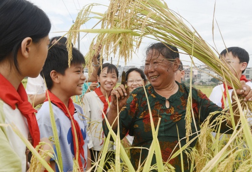 10月15日,嘉禾县行廊镇石凉亭村,嘉禾矿学校学生在聆听村民讲述水稻知识。黄春涛 朱莉 摄