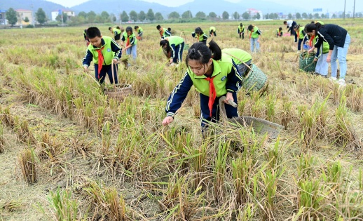 10月15日,洞口县竹市镇中心小学学生在收割后的稻田捡拾稻穗。滕治中 摄