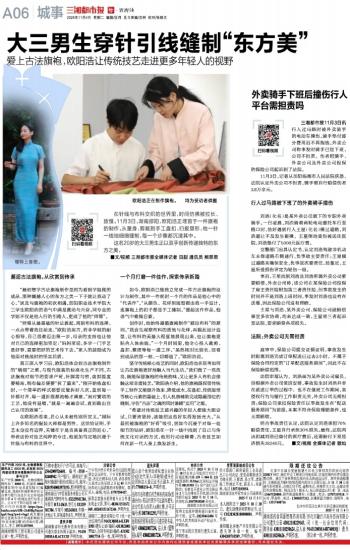 大三男生穿针引线缝制“东方美”