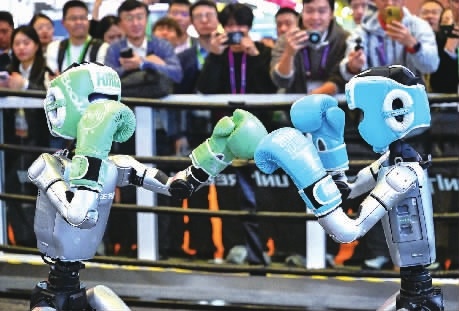 11月6日,在第八届进博会技术装备展区宇树科技展台,两台G1人形机器人的格斗表演吸引了众多观众。它们戴着护具及拳套,施展直拳、勾拳、左右鞭腿,展示倒地自主起身等复杂动作,不时赢得观众喝彩。据介绍,这款亮相表演的人形机器人身高132厘米,体重约35公斤。 新华社 图