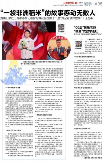 在第26个中国记者节来临之际,新闻战线捷报频传。11月6日,第三十五届中国新闻奖颁奖报告会在北京举行。会上,湖南日报社三湘都市报记者曾冠霖从全国参选者中脱颖而出,荣获全国新闻界第十二届“好记者讲好故事”活动“十佳选手”称号,成为本届活动中湖南省唯一获此殊荣的新闻工作者。