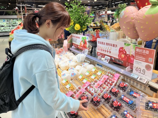 在盒马鲜生南门口店,记者看到冷藏货架上摆放着智利进口的车厘子,暗红色的果实饱满圆润,表面的果霜清晰可见。