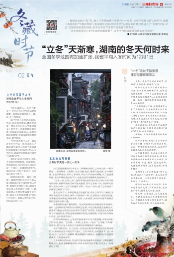 刚刚过去的11月7日,进入了冬季的第一个节气——立冬。立冬不仅是日历上的节气,更是一条动态的“气候边界线”。我国幅员辽阔,到立冬节气,部分地区就已经进入了“冬藏”阶段。不过,仍被秋韵包围的湖南,似乎还未在立冬时节迎来真正的冬天。