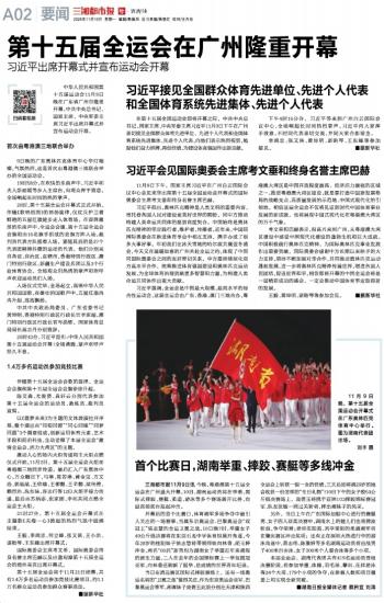 中华人民共和国第十五届运动会11月9日晚在广东省广州市隆重开幕。中共中央总书记、国家主席、中央军委主席习近平出席开幕式并宣布运动会开幕。