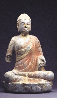 第二件展品来自青州市博物馆的贴金彩绘佛坐像,是青州窖藏造像中极为少见的坐姿形态。面相端圆、眼角微扬、嘴角含笑,既有出尘之静,也富温暖世俗气息。