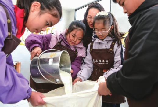 “这是我们小组磨的豆腐!”11月24日,长沙浏阳大围山镇东门完全小学,孩子们在上劳动课——制作豆腐。带着泥土气息的非遗技艺走进课堂,被网友们称赞为“真正的素质教育”。据了解,白沙豆腐本是当地有名的特产,两年前被正式“请”进课堂,成为孩子们触手可及的劳动教材。
