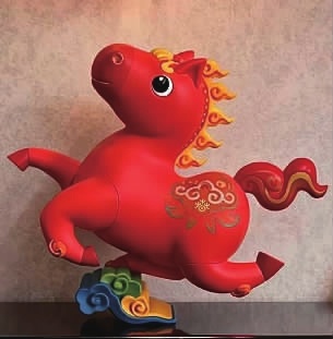 “吉祥马”以甘肃武威出土的东汉铜奔马——马踏飞燕为设计灵感,借鉴唐代五花马的鬃毛装饰手法,主色采用中国红,辅以祥云纹、如意纹等经典传统纹样,体现中国春节温暖、喜庆的氛围。