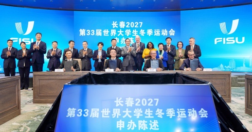 11月26日,嘉宾在承办合同签署仪式现场合影。当日,国际大学生体育联合会主席雷诺·艾德在吉林省长春市举行的第33届世界大学生冬季运动会新闻发布会上宣布,吉林省长春市成功申办2027第33届世界大学生冬季运动会。新华社 图