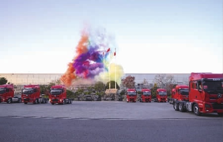 11月28日,长沙县三一智联重卡产业园,三一重卡举行第四批英雄车主免费换车仪式,为28名早期用户交付全新车辆。今年是三一重卡第四次开展免费换车活动。图为发车仪式现场。