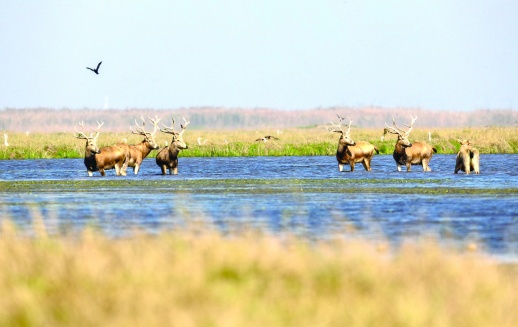 11月28日,在位于南洞庭湖区的沅江市,6只麋鹿在陈家湖的湖洲上觅食栖息。初冬的暖阳下,麋鹿与越冬候鸟和谐共处,构成一幅生动的生态画卷。