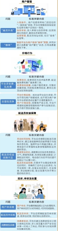 统一收费项目。针对行业内收费项目繁杂、名称众多、规则不清等问题,标准在收费项目设置上,将平台向商户收取的费用统一为技术服务费、配送服务费和推广服务费三大类,并要求平台简化收费规则,让商户清楚知道“收的什么费,收多少费”等关键信息。
