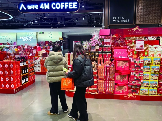 1月29日,长沙万象城负一楼的Ole精品超市年货区已换上年味装饰,记者看到,车厘子礼盒、坚果大礼包、零食礼盒等年货被整齐堆叠成一座座“红色小山”,占据卖场进出口的核心“C位”。
