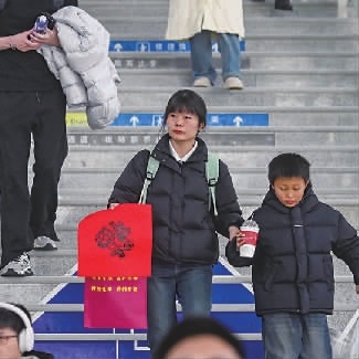 而在长沙火车站内大堂,小学五年级的易同学正在参加车站组织的春运首日活动。“感觉今天好热闹呀,领了对联、贴花……”他兴奋地向记者展示着自己获得的奖品。当问及春运是什么时,易同学反复思考后回答:“春运就是回家过年”。