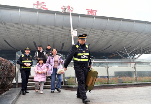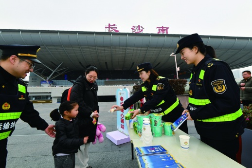2月12日,春运进入第11天,长沙南站客流量持续攀升,当日预计发送旅客17万人次、到达旅客22万人次。春运期间,长沙市交通运输执法部门全面加强春运保障工作。执法人员通过强化巡查执法、成立春运先锋岗、设置“春运暖心驿站”等服务举措,在维护运输秩序的同时为旅客提供便民服务。图为长沙市交通运输综合行政执法支队的执法人员在为旅客提供便民服务。