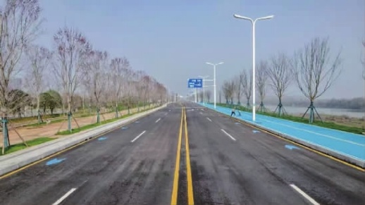 住在江边,既要安全,也要风景。在大泽湖畔,湘江西岸望城段堤防提标改造工程已基本完工,进入交安设施安装及调试扫尾阶段。项目全长13.82公里的防洪大堤,堤顶平均加高1.5米,路面拓宽至22米,双向四车道平坦开阔,滨江风光尽收眼底。