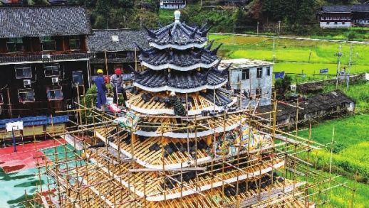3月24日,通道侗族自治县双江镇芋头村,工匠在修建侗族鼓楼。鼓楼作为侗族村寨的标志性建筑,建成后将为村民提供集会、议事、文化娱乐的公共活动场所,进一步完善乡村文化服务设施。