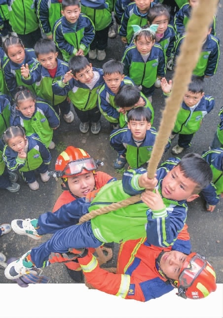 3月30日,小学生在消防员的辅导下学习绳索攀爬技能。当天是全国中小学生安全教育日,道县消防救援大队邀请道县第四小学的学生走进消防营区开展安全教育活动,提升安全防范意识和自我保护能力。
