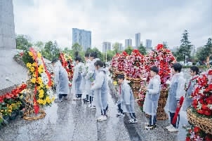4月3日,长沙市万境第二小学师生向人民英雄纪念碑敬献鲜花。清明节临近,社会各界民众怀着崇敬的心情,走进湖南革命陵园,向人民英雄纪念碑敬献鲜花,缅怀革命先烈的丰功伟绩。