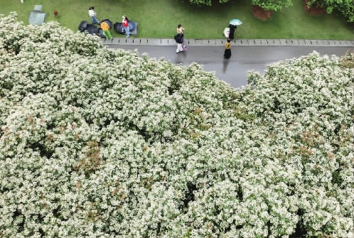 4月14日,长沙市沙湾公园内的石楠花迎来盛花期,成片洁白花簇缀满枝头,远望如落雪覆枝,成为暮春一道别致景致。