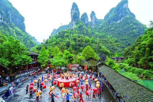 4月15日,吉首市矮寨德夯苗寨景区,游客在观赏苗家鼓舞表演。当天,各地网络达人齐聚天问台、矮寨大桥、德夯苗寨、流纱瀑布等景点,通过民族风情展示和线上传播,向外界推介湘西文旅资源,助力当地旅游发展。