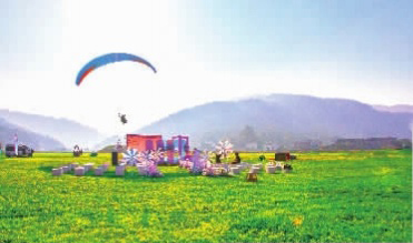 天气晴好的周末,黑麋峰滑翔伞飞行体验基地引来不少高空极限挑战者。五彩斑斓的滑翔伞从垂直落差近800米的上空降落,形成一道靓丽的风景线。“要是出太阳的日子,这里就是漫天‘飞人’了,热闹得很。”桥驿镇新屋湾美丽屋场村民易爹爹说。